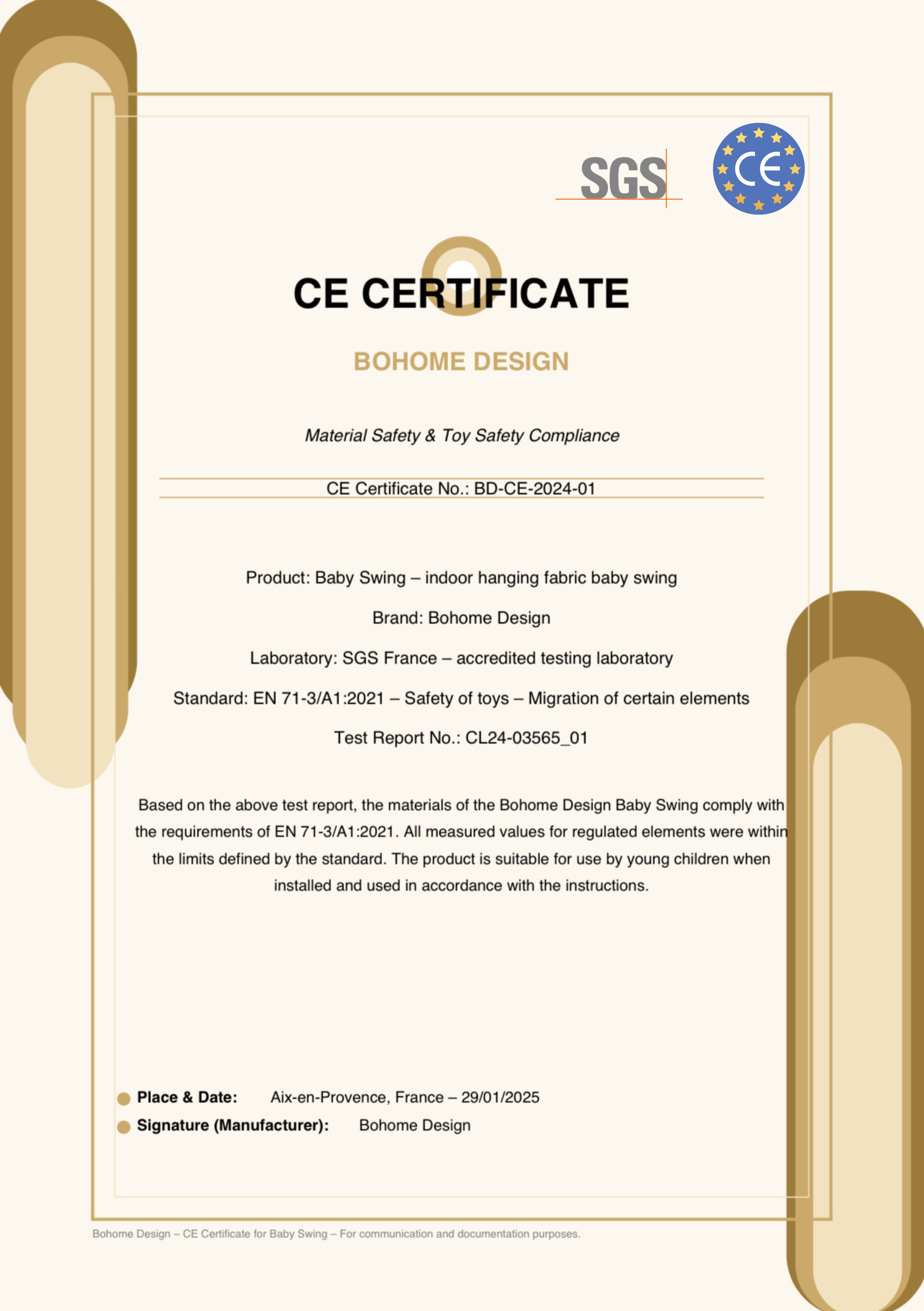Unsere Baby-Schaukel wurde im akkreditierten SGS-Labor in Frankreich nach EN 71-3/A1:2021 geprüft.